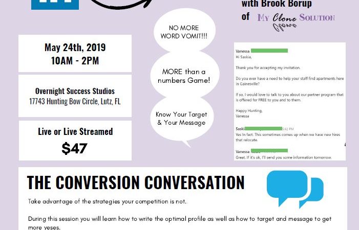 If you’re looking to maximize your LinkedIn presence, check out this fantastic workshop hosted by Brook Borup of My Clone Solution on May 24. Call 813-442-9925 or e-mail [email protected] to reserve your spot today!