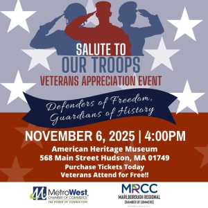 Check out the upcoming Veteran’s Appreciation Event, happening on November 6th at 4pm at the American Heritage Museum, held by Marlborough Regional Chamber of Commerce. Veteran’s attend for free by contacting the office. Ticket price includes a tour of the museum, speaker, food and drinks! Visit the website for more information.
