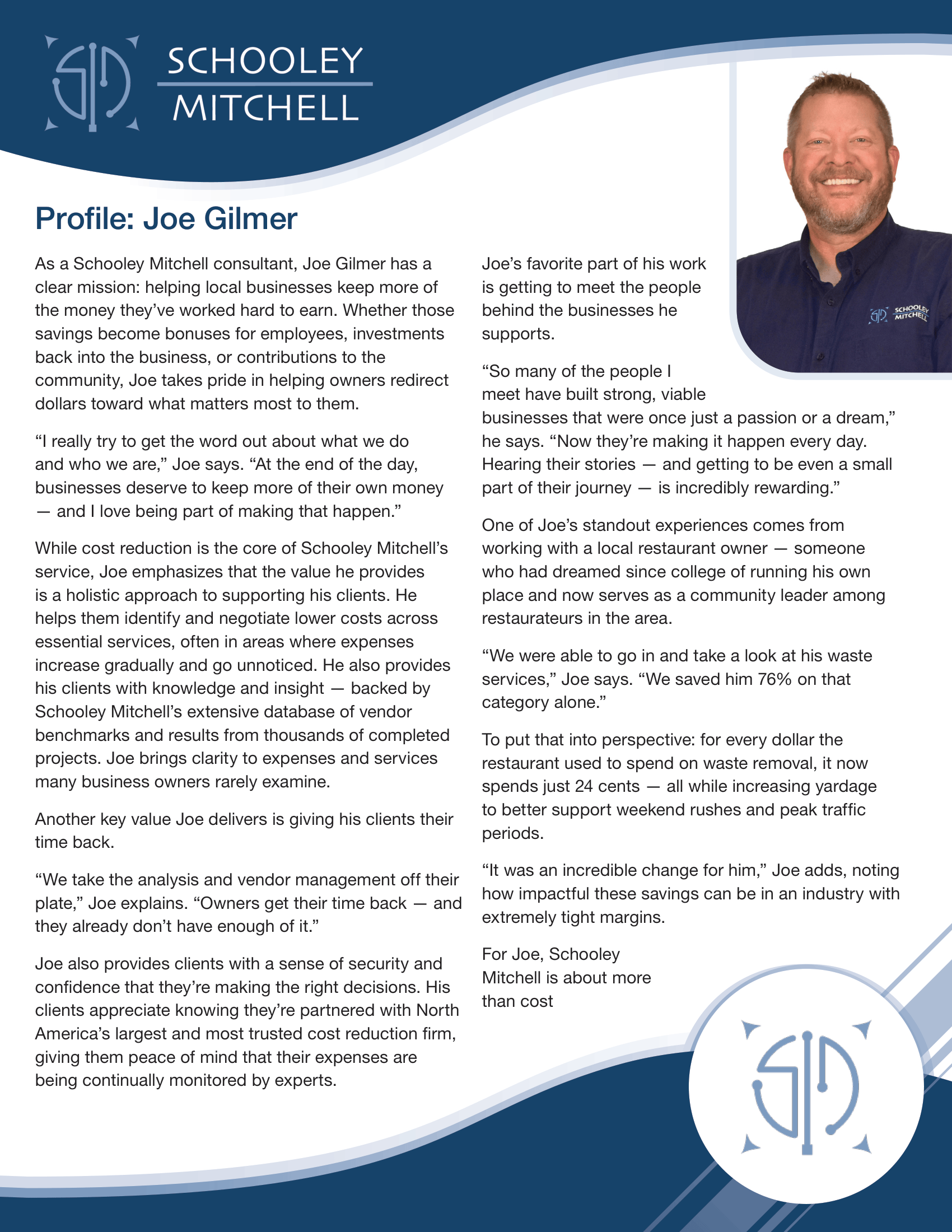 "Joe and his team delivered a thorough, professional review of our existing contracts and vendor relationships. In the case of waste services, they presented us with an alternative that would save us 76% - an incredible result. As for our facility supplies, their review concluded that our current contract was the best option, due to high early termination fees - and we appreciated the transparency."
